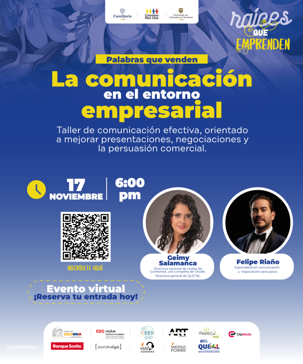 Cet événement fait partie du programme Raíces que Emprenden, une initiative du Consulat de Colombie à Montréal et de Colombia Nos Une, Casas Colombia, Banque Scotia, Art Graphic Studio, Clip Media, Point Colombie, Sourcio-ologie, Magnus Poirier, avec le soutien de partenaires engagés dans le renforcement de l’écosystème entrepreneurial latino au Québec.